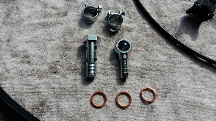 Beim Ausgang Benzinfilter mit Doppelhohlschraube Ringnippel und die original Benzinleitung anschrauben.