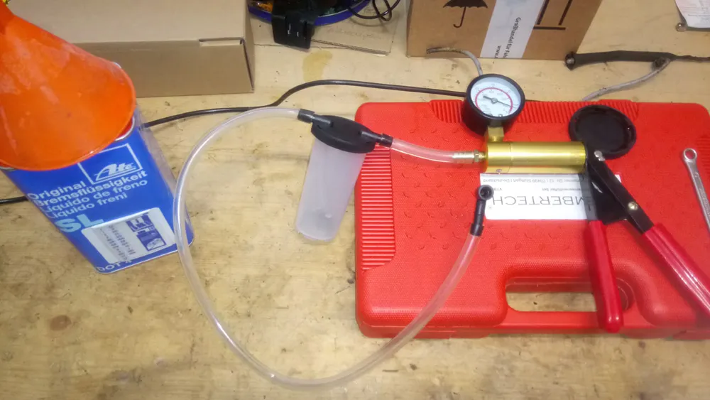 Anschließend ging es ans Entlüften bzw. den Austausch der Bremsflüssigkeit. Dafür hab ich mir ein System zugelegt (siehe Bild), was sich sehr gut machte.