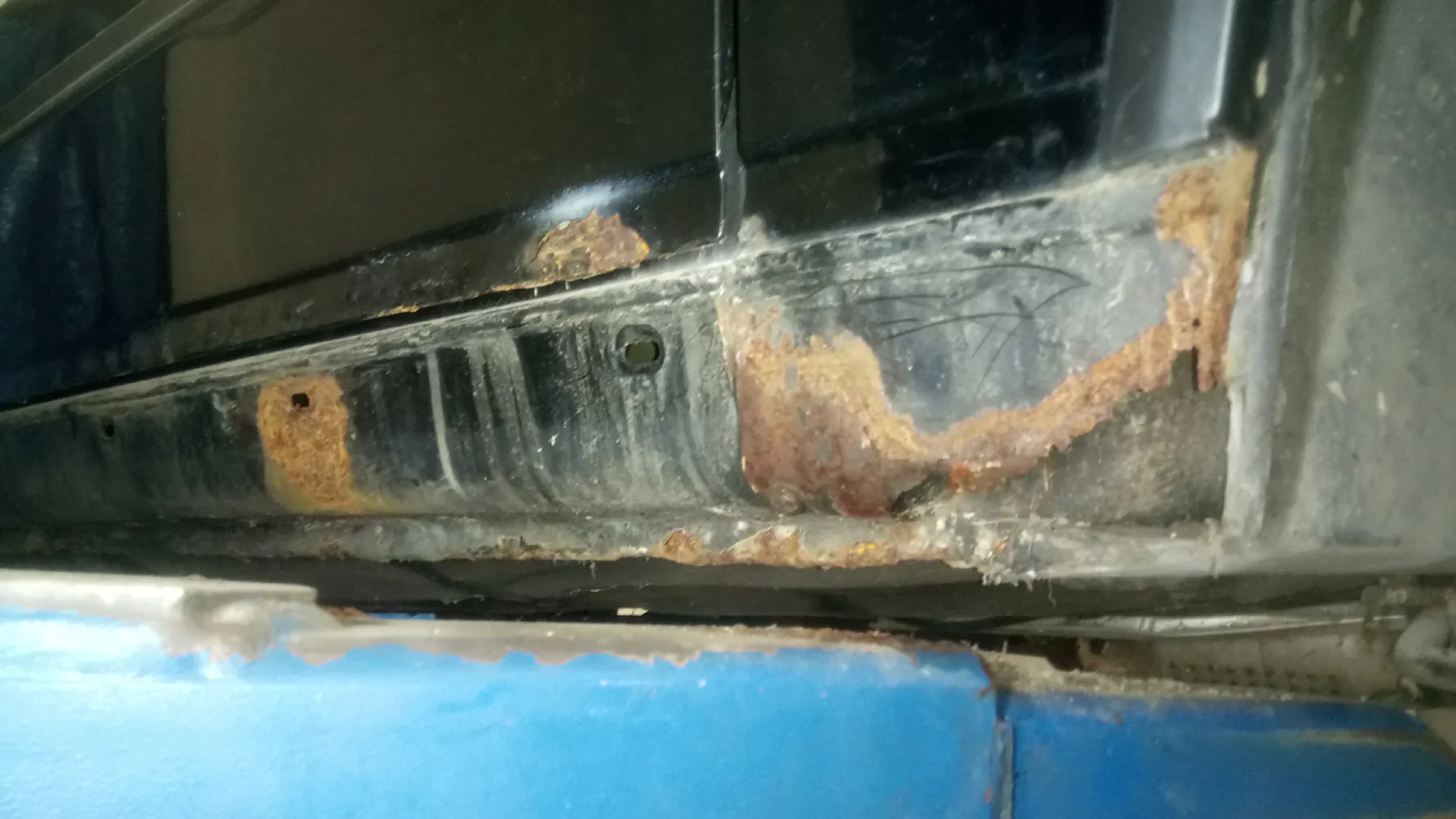 • Anbei mal ein paar Bilder von der rostigen Bereichen. Ist schon heftig finde ich. Es müssten mindestens die beiden Schweller mit den angrenzenden Blechen gemacht werden und wer weiß, was noch alles im Verborgenen ist... daher meine Überlegung eine (fast) rostfreie Karosse zu suchen.