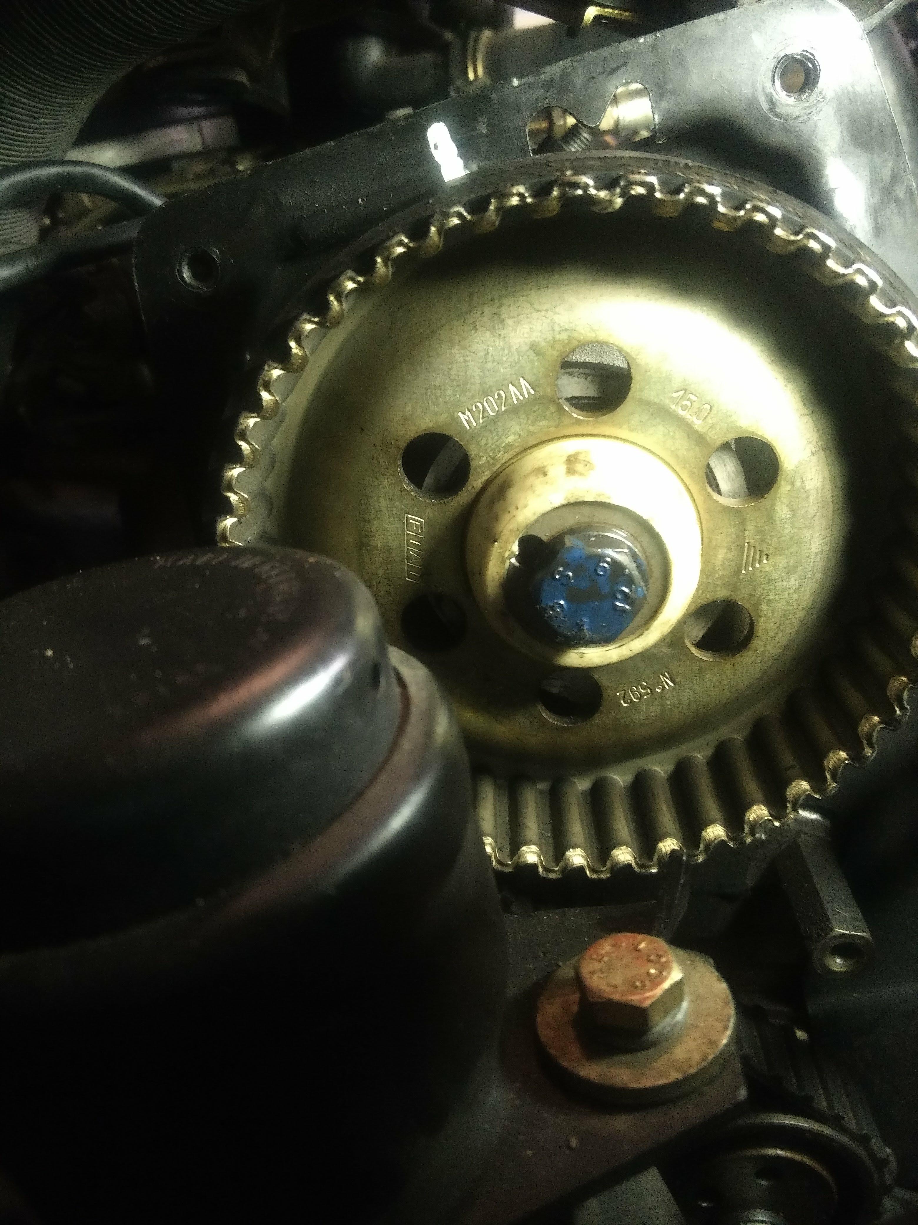 Hier die Markierung am Zahnrad der Nockenwelle - sieht man schlecht, aber bei dem Pfeil im Blech ist innen eine weisse Markierung