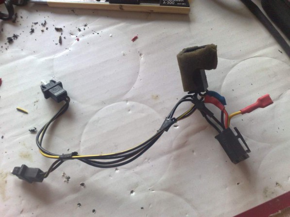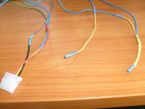 Kommen wir zum Kabelbaum, den hab ich mir aus ein paar Kabeln zusammengebaut die grade so verfügbar waren. Da ich als Informatiker den Schalter zum durchmessen mal mit auf arbeit hatte fiel mir positiverweiße auf das ein gewöhnlicher 5,25" Stromstecker eines PC-Netzteils perfekt in die Steckaufnahme passt. Vorrausgesetzt das man die darinbefindlichen Buchsen ein wenig aufweitet.