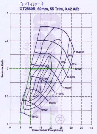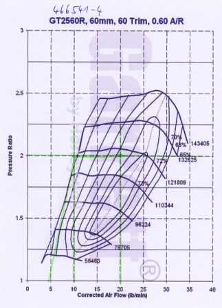 Der GT2560R wird einige Umdrehungen (200-300rpm schätze ich mal) später kommen im Vergleich zum GT2860R (PR 2 Bar, 10lb/min) muss man aber auch aufpassen wegen der Pumpgrenze. Gibt ja jetzt für die kleinen Lader auch Anti Surge Verdichtergehäuse, da ist das Kennfeld nach links erweitert weil die Luft an der Turbine vorbei kann (weil der Motor mehr haben will wie der Lader liefern kann) - mal grob erklärt.