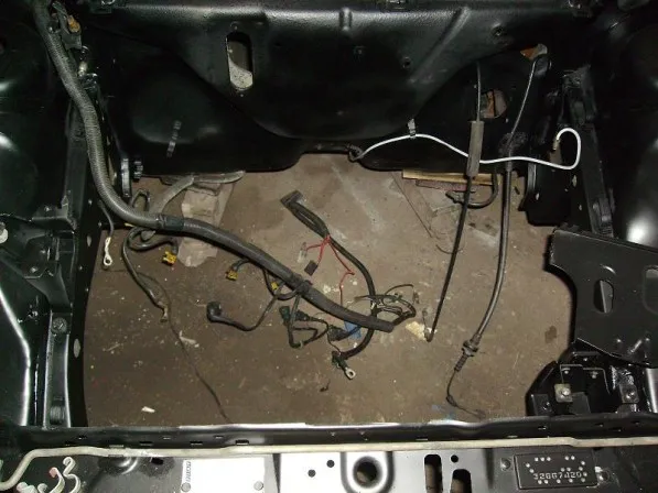 Und der leere Motorraum der Trägerkarosse, Kupplungszug und Gaszug sind noch vom 45iger, Motorhalter schon vom Turbo.