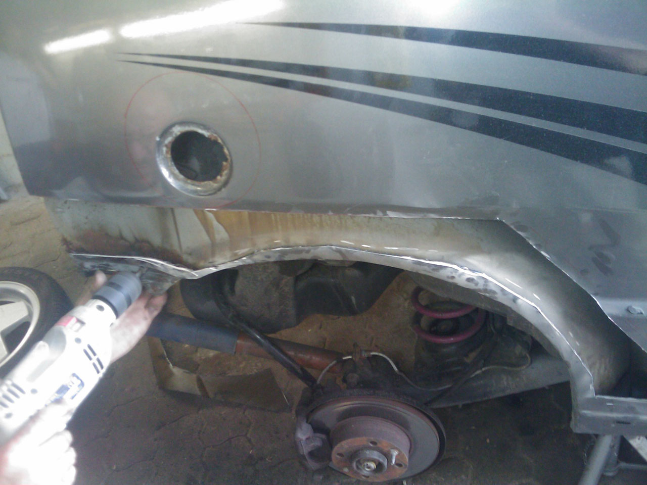 Hier wurde bereits der Radlauf raus getrennt, der Innenradlauf kommt auch raus. Wir haben erstmal die Schweißpunkte aufgebohrt, damit wir vor dem Flexen sehen was wirklich raus muss und was nicht.