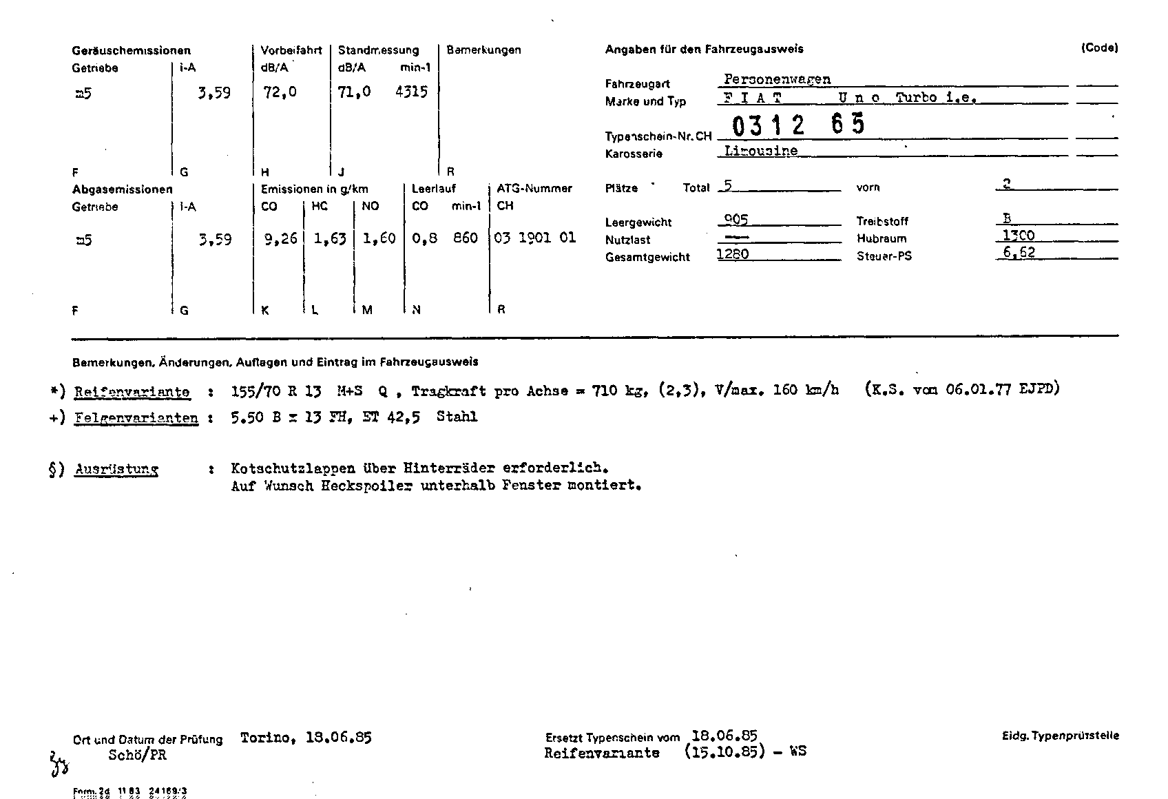 Fiat Uno Turbo MK1 Typzulassungsunterlage Schweiz